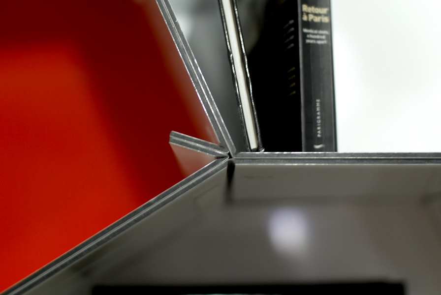 Dimensions : L54 cm H35,5 cm P30 cm matériaux: Alucobest: feuille de polyéthylène prise en sandwich entre deux feuilles d’aluminium laqué fond couleur: PMMA laqué Finition: intérieur laqué brillant extérieur laqué mat Coloris: Module: Noir / Blanc Fond: Rouge / kaki / pétrole autres coloris sur demande