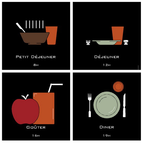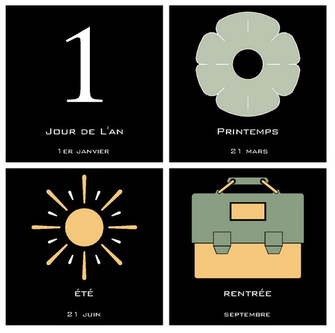 -les vignettes clefs: plus grandes que les vignettes actions elles illustrent les étapes clefs de la journée (repas), de la semaine (nuit), de l'année (JDL, rentrée,...). Ces vignettes constituent les points cardinaux d'une représentation circulaire du temps et des étapes dans une représentation linéaire.