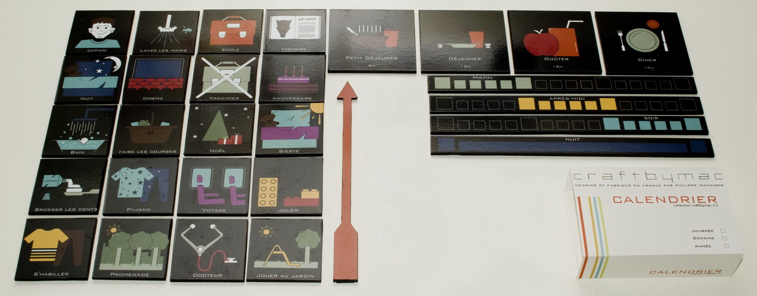 Calendrier éducatif pour enfants, permettant l'apprentissage des notions de temps :journée, semaine et année. Le calendrier est constitué de cartes magnétiques, faciles à manipuler, qui peuvent être agencées pour visualiser le temps de façon circulaire ou linéaire.