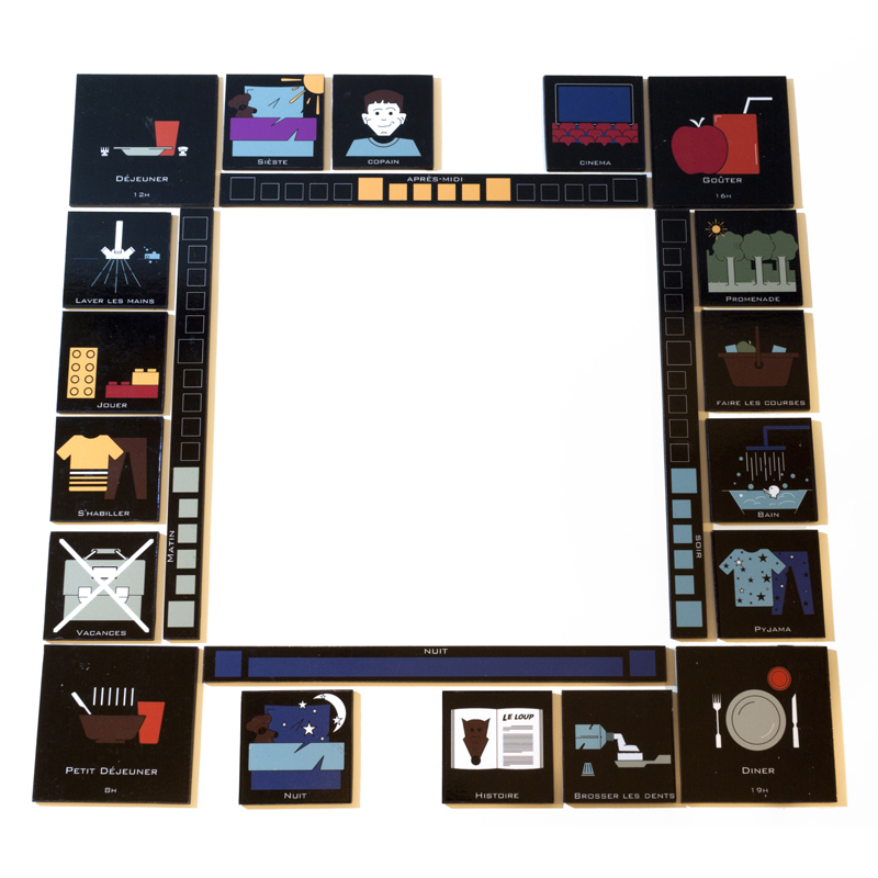 -les vignettes clefs: plus grandes que les vignettes actions elles illustrent les étapes clefs de la journée (repas), de la semaine (nuit), de l'année (JDL, rentrée,...). Ces vignettes constituent les points cardinaux d'une représentation circulaire du temps et des étapes dans une représentation linéaire.